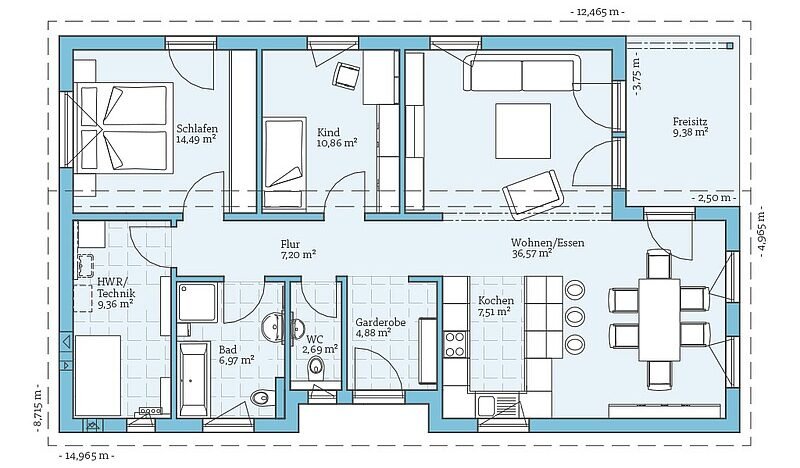 Enterijer se takođe može u potpunosti prilagoditi ličnim željama. Otvoreni koncept dnevnog boravka, trpezarije i kuhinje, kao i spavaće sobe i kupatila, pružaju slobodu u uređenju prema sopstvenom ukusu. Sa ukupno 109 m², ova montažna kuća nudi dovoljno prostora da svoje ideje realizujete bez ograničenja.